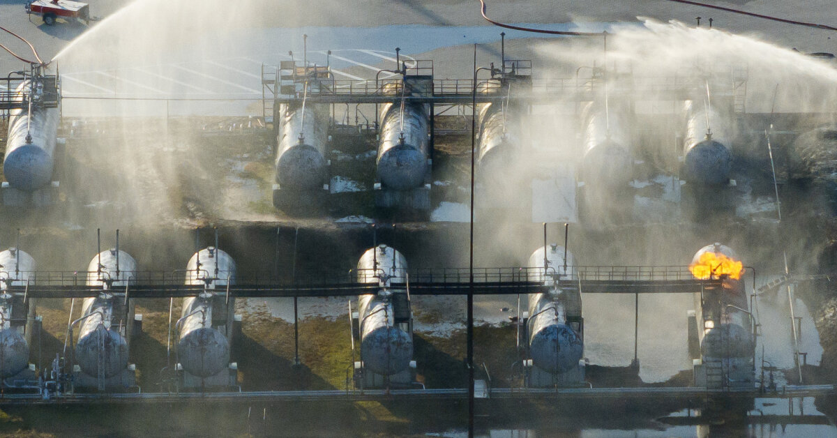 Šalia jų stovi daug didelių dujų talpyklų.