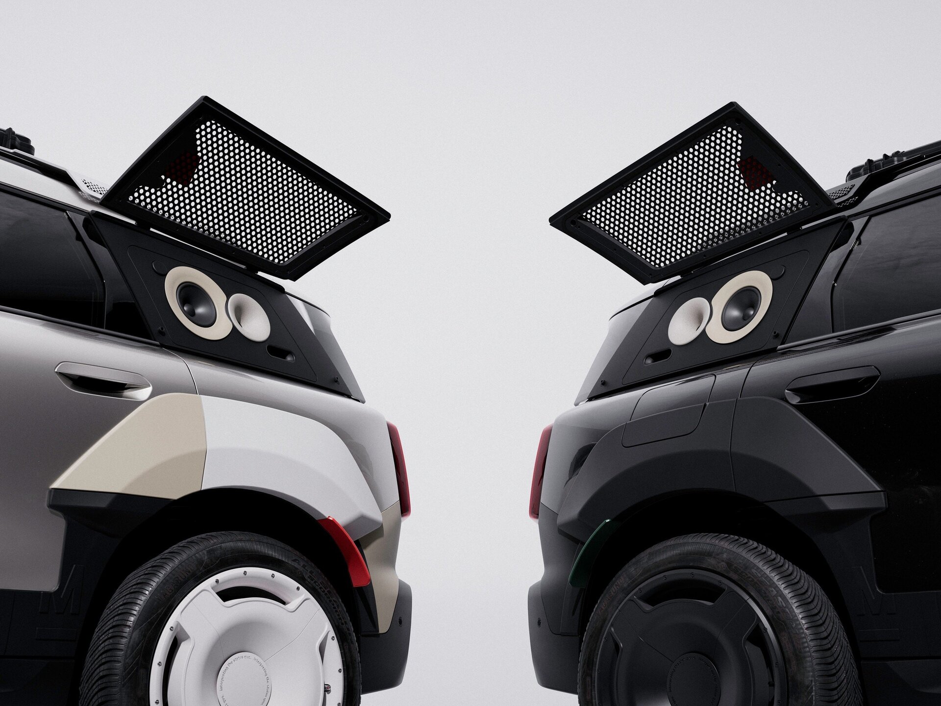 Tačiau pati originaliausia detalė – galingos audio sistemos išoriniai garsiakalbiai. Jie sumontuoti vietoje galinių langų ir uždengti specialiais dangčiais. Sustačius du MINI specialiu kampu gaunasi improvizuota muzikinė scena.