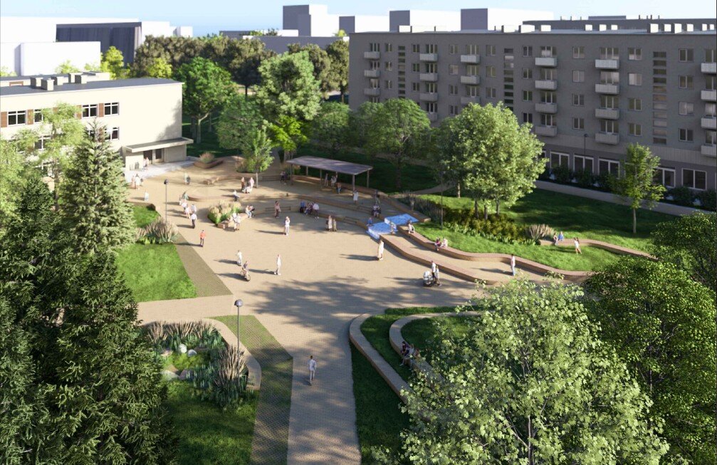 Naujamiestyje, Naugarduko g. 47, Vilniaus vystymo kompanija jau pradėjo darbus – čia bus įrengtos poilsio ir sporto erdvės, atnaujinta krepšinio aikštelė ir sutvarkytas parkavimas. Darbus planuojama užbaigti 2027 m. III ketvirtį.